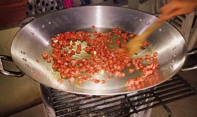 El ejercicio paellero con aroma a azafrán, estuvo excelentemente coordinado por nuestra radiante “Chef Paellera Catrina Flamenca ” Soraya López, quien desde hace varios años elabora por placer este platillo para familiares y amig@s, y quien es ya, nuestra “Jefa del Equipo de Elaboración de la Maltosa Paella de MCCM” en Ensenada. Con una tina de lavadora como asador, una parrilla mágica guarda secretos, una paellera caliente brillante con aceite, un trío de cucharas, y bajo el ojo atento de nuestra bien peinada Chef – muy bien respaldada por dos “Guardianes del Fuego” – los integrantes del equipo, empezamos el ritual mágico de la preparación. Uno a uno y cuidadosamente se fueron agregando los ingredientes: la chistorra, el camarón, calamar, pulpo, carnita y pollito; luego el arroz, el caldito y la verdura. Todos sonrientes, concentrados y muy pacientes.