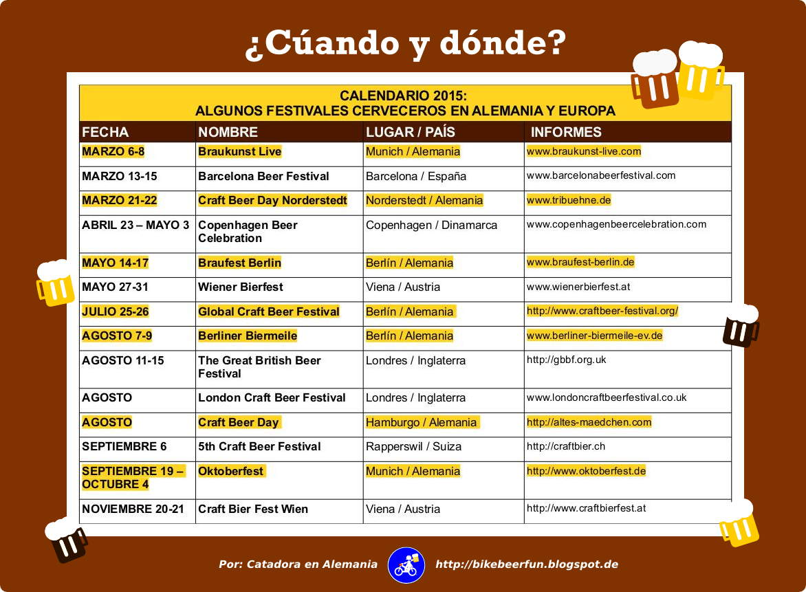 Para iniciar bien el año y para que vayan agendando, les comparto un calendario de algunos festivales cerveceros que se llevarán a cabo en Alemania y en Europa. Tal vez les sea útil si ya están en este continente o por si piensan darse una vueltecita. ¡Saludos a todos!… y como dicen en Alemania: Frohes Neues Jahr!