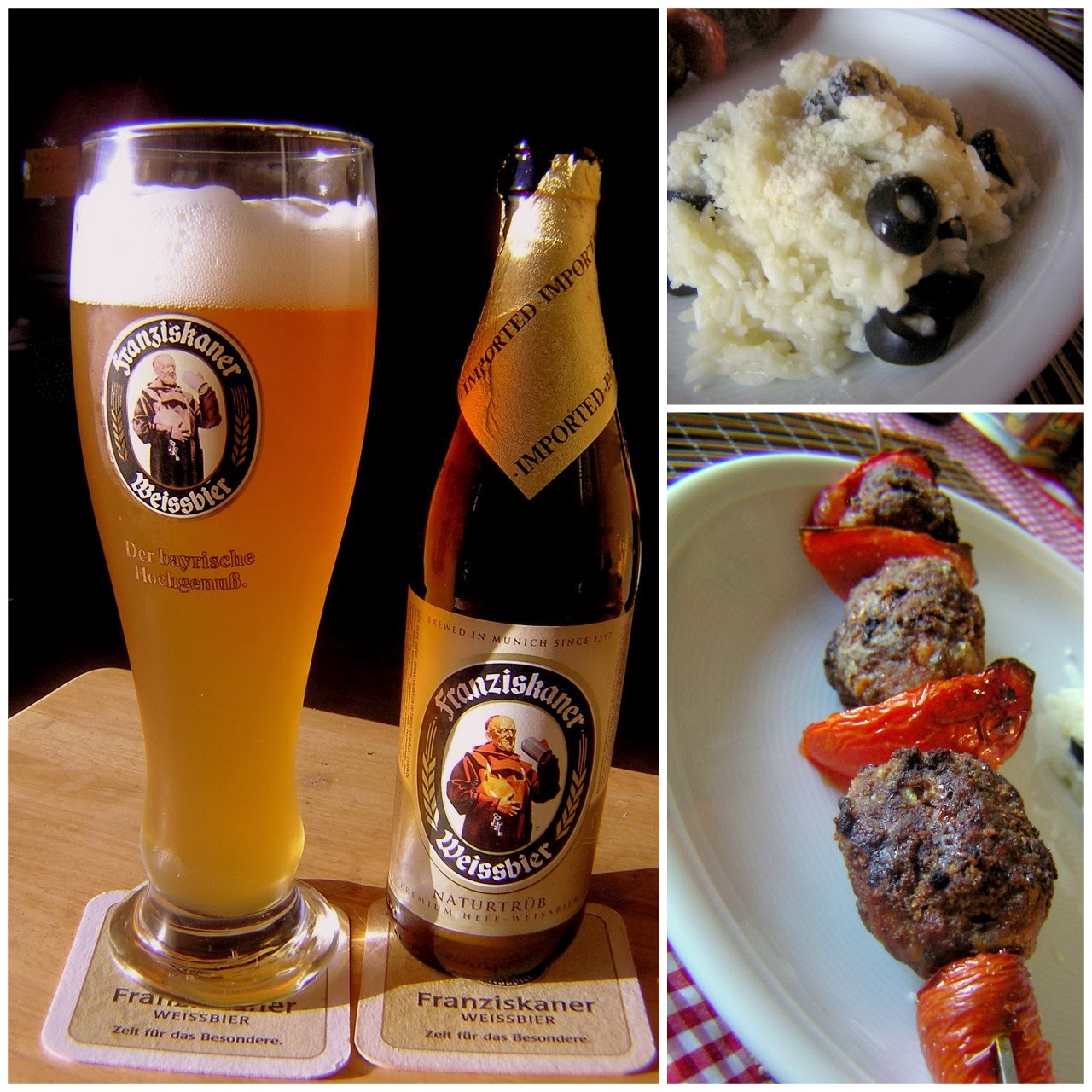 Cerveza Franziskaner. Origen Alemania. Cervecería: Spaeten-Franziskaner Braeu. Estilo Hefeweizen. 5% alcohol. Maridaje con brochetas de carnita de puerco y arroz con aceitunas negras, ¡ mmm!