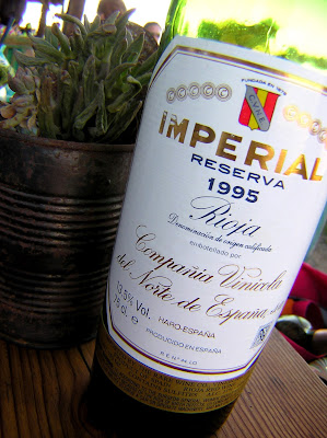 Para acompañar los platillos, el cumpleañero compartió un par de botellas de vino Rioja, denominación de origen calificada, de la Compañía Vinícola del Norte de España, S. A : Imperial Gran Reserva, cosecha 1994 e Imperial Reserva, cosecha 1995. ¡ Uf!, de luuujo: exquisitos, elegantes, sofisticados y aterciopelado sabor, muy bien estructurados. ¡ Placer T O T A L! para recordar casi toda la vida y con lágrimas en los ojitos. Antes de estos dos vinos, consumimos un vino blanco de Las Nubes, muy refrescante y recomendable.