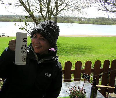 Cerveza estilo Zwickel o Kellerbier Ese día, del otro lado del río Weser, recorrí algunos campos, pasé por un aeropuerto pequeño y llegué hasta un lago, donde había un fabuloso restaurante, ahí, hice una parada placentera para refrescar el cuerpecito. Tuve la fortuna y sorpresa que vendían unas cervezas Zwick’l y que las servían en un bonito tarro de cerámica, original de la cerveza. Me tomé dos, y como no había comido, pues las sentí pegadoras je je… Cervecería: Bayreuther Bierbrauerei Origen: Bayreuth, Alemania Estilo: Kellerbier Alcohol: 5.3% Aromas y sabor a malta, caramelo, melaza. Un ligero sabor a lúpulo. Es una cerveza no filtrada. No la describo más porque ya no me acuerdo, pero sí sé que estaba deliciosa, muy refrescante e ideal para disfrutarla donde la tomé: con vista a un bonito lago.
