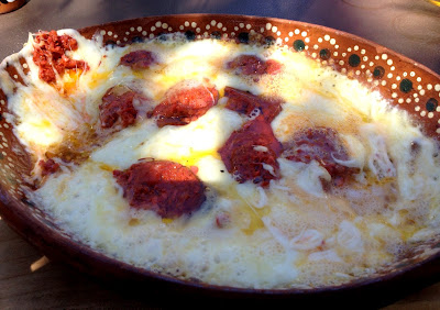 Mis acompañantes y yo, pedimos para empezar un queso fundido con chorizo español, muy bien reportado, el pan para acompañarlo es elaborado ahí en el horno de piedra. Luego, pedimos una orden de carne asada para varias personas, la cual la sirven en un “calentador de aluminio” que ponen sobre la mesa: traía todo tipo de carnes, incluyendo chorizo español; también las hay con longaniza y tripitas. Las tortillas de maíz y de harina, son hechas a mano en vivo y a todo color por una sonriente señora, así como la salsa fresquecita que el mesero prepara frente a los ojitos de los comensales.