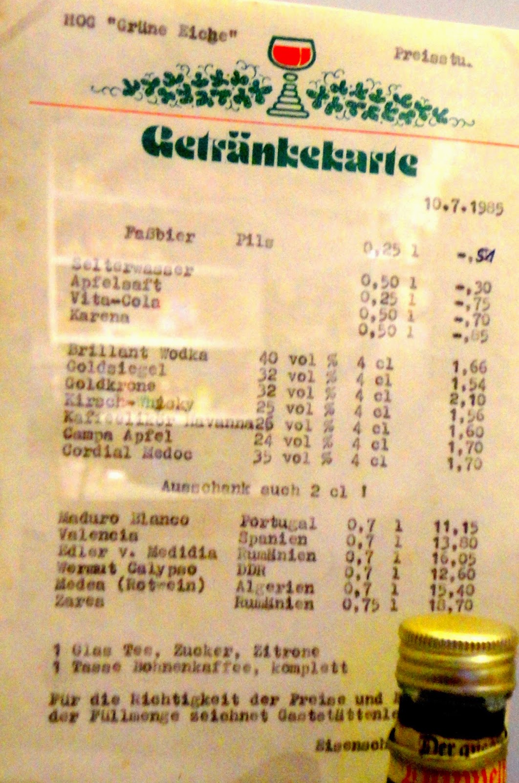 El tema bebidas y cerveza me llamó la atención, por lo que después de la exposición, me puse a investigar más en detalle sobre el tema. Les comparto en conclusión lo que encontré: En la República Democrática Alemana no faltaban bebidas alcohólicas, principalmente los licores como ron, doppel korn, y por supuesto, vodka, llamados “Schnapps” . Licores era lo que más se producía en la RDA, y lo más accesible de conseguir.